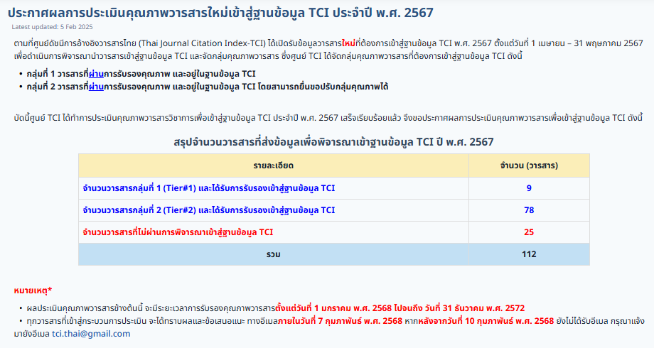 ประกาศผลการประเมินคุณภาพวารสารใหม่เข้าสู่ฐานข้อมูล TCI ประจำปี พ.ศ. 2567 เมื่อ 5 ก.พ. 2568